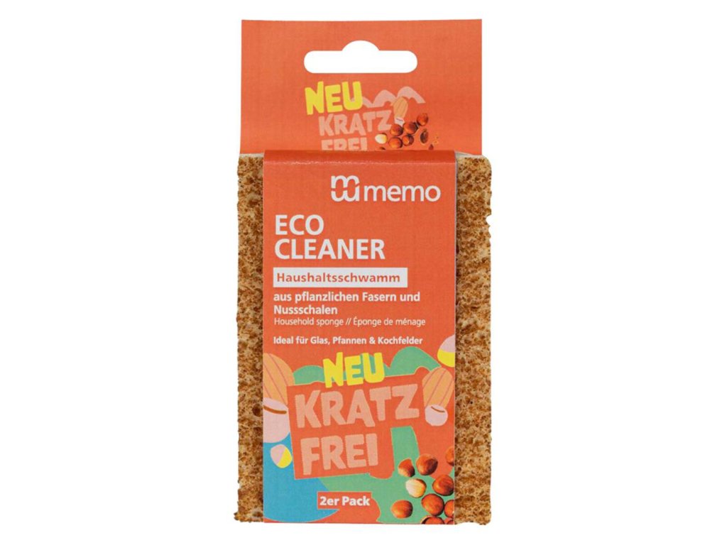 Memo domácí houbička Eco Cleaner je udržitelná úklidová pomůcka složená z měkké celulózové vrstvy a unikátní abrazivní vrstvy z mletých ořechových skořápek. Slouží k univerzálnímu mytí nádobí a čištění povrchů v celé domácnosti, přičemž efektivně odstraňuje připáleniny i mastnotu bez uvolňování mikroplastů a chemických barviv.