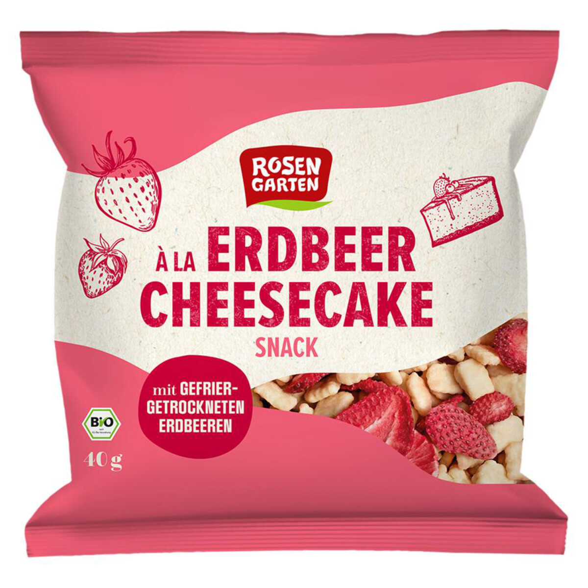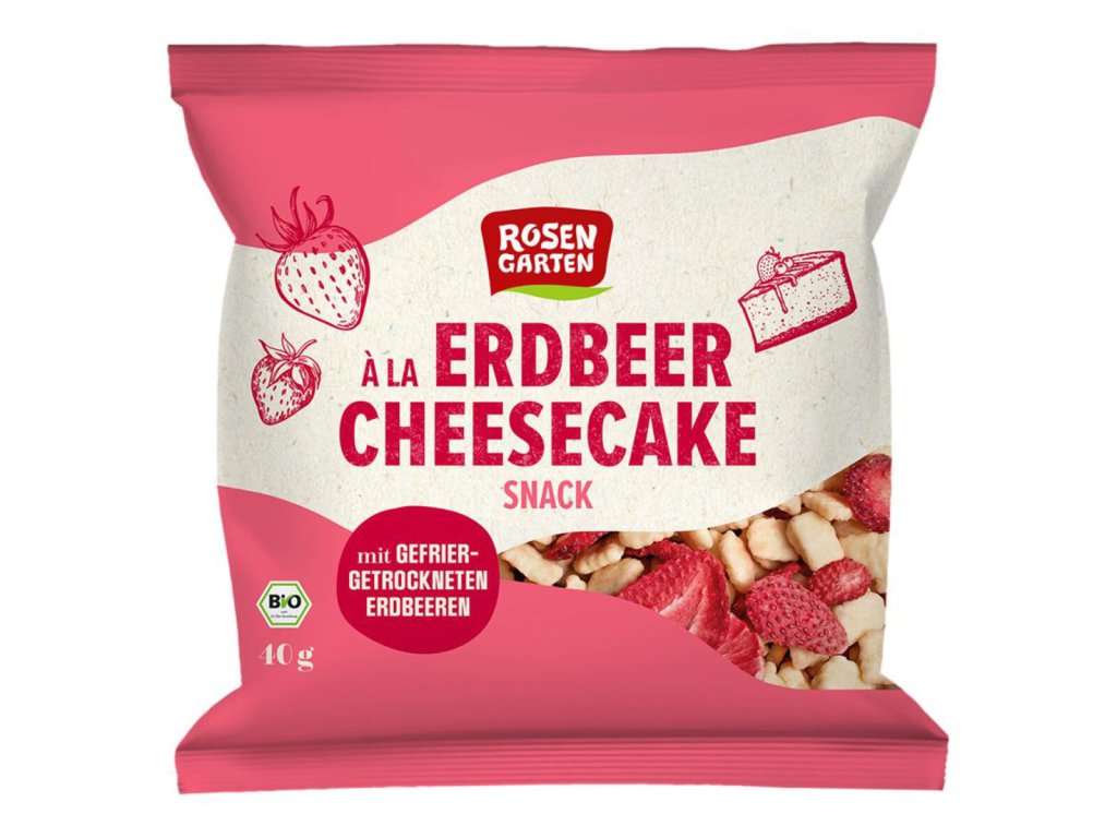 - Jahodový cheescake snack - jemné mini máslové sušenky obalené v bílé jogurtové čokoládě smíchané s lyofilizovanými jahodami .