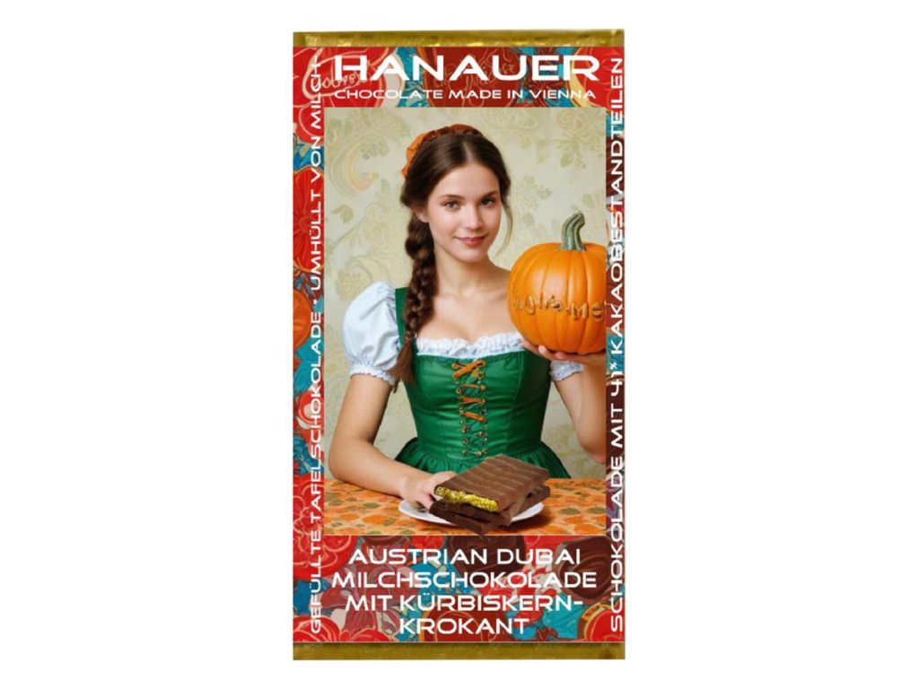 - Rakouská Dubaj čokoláda - odpověď na humbuk kolem "dubajské čokolády" - 41% mléčná čokoláda s křupavou čokoládovou náplní z dýňových semínek z andělských vlasů.