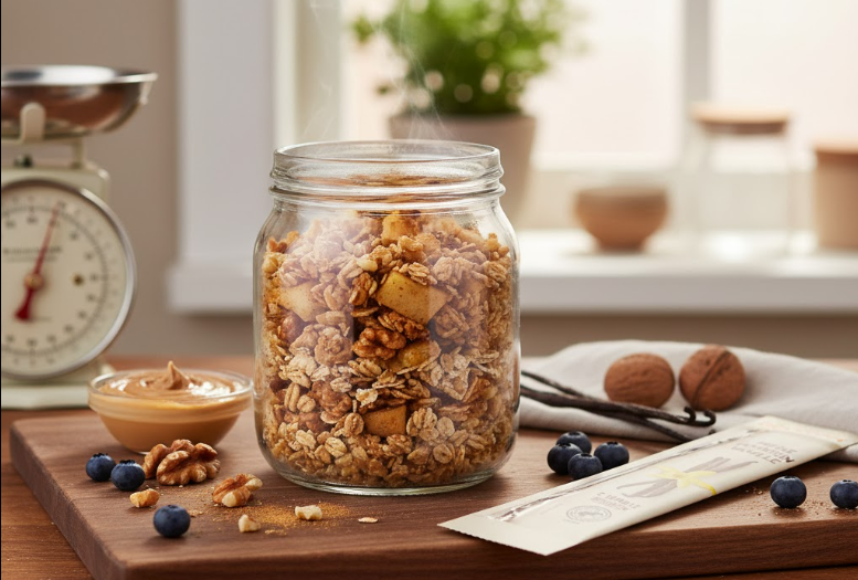 Bourbonovou vanilkovou granolu pečte 20 až 25 minut dozlatova. V polovině doby pečení granolu otočte dřevěnou špachtlí a opět ji rovnoměrně rozložte na plech. Po upečení nechte granolu úplně vychladnout – bude tak ještě křupavější. Volitelně ji můžete po vychladnutí vylepšit jemně nasekaným sušeným ovocem, čokoládovými lupínky nebo kokosovými vločkami.