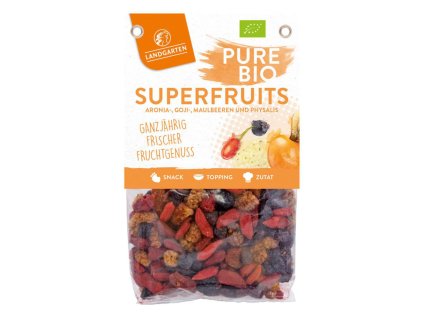 Rozmanitá síla barevných, sušených bobulí shromážděných v chutném výběru: goji, aronie, mochyně a moruše ve 100% bio kvalitě.