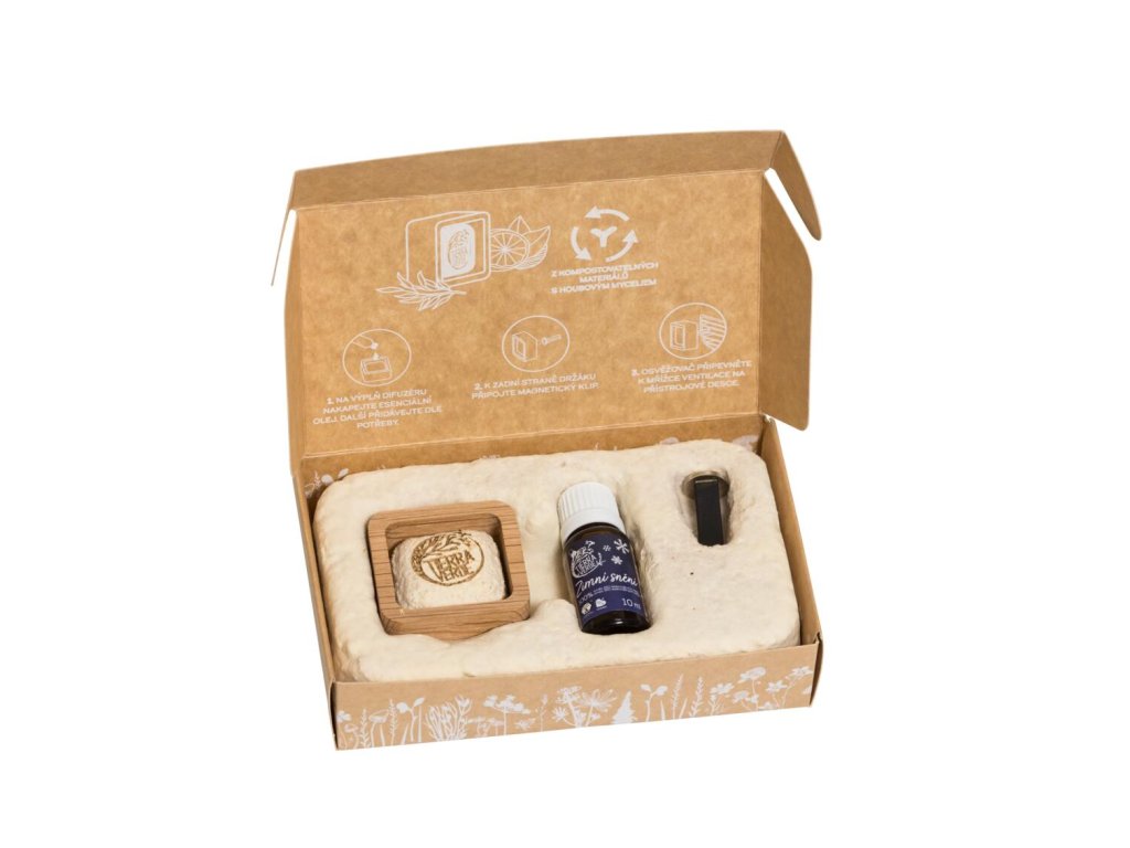 Součástí sady je lahvička s BIO směsí Zimní snění – harmonické spojení sladkého pomeranče, skořice, hřebíčku a borovicové pryskyřice. Tato vůně zklidňuje, uvolňuje a navozuje pocit hřejivé zimní atmosféry.