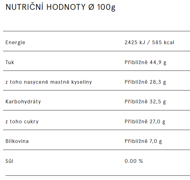 Použité je pouze vysoce kvalitní bio Trinitario z Dominikánské republiky a Panamy, případně jemná odrůda kakaa Criollo.