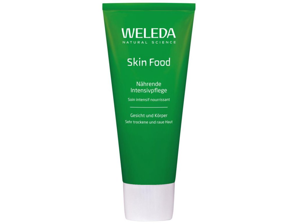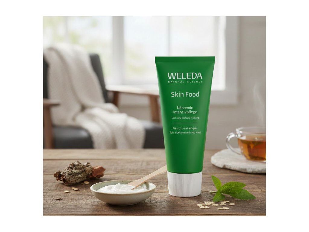 Lze Weleda Skin Food použít jako pleťovou masku? Ano, pro hloubkovou regeneraci naneste silnější vrstvu krému na obličej a nechte ji působit zhruba 15 minut. Poté nevstřebané zbytky jemně vmasírujte do pokožky nebo setřete pro dosažení maximální hebkosti.